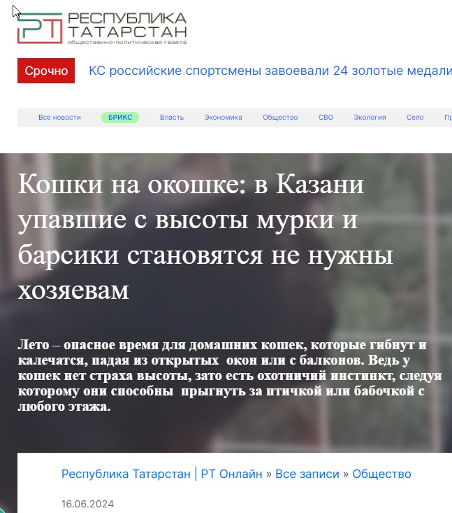 Поведенческая особенность кошек, приводящая к большой вероятности их падения с высоты в городах и характерные этим происшествиям травмы получили название – высотный синдром кошек.