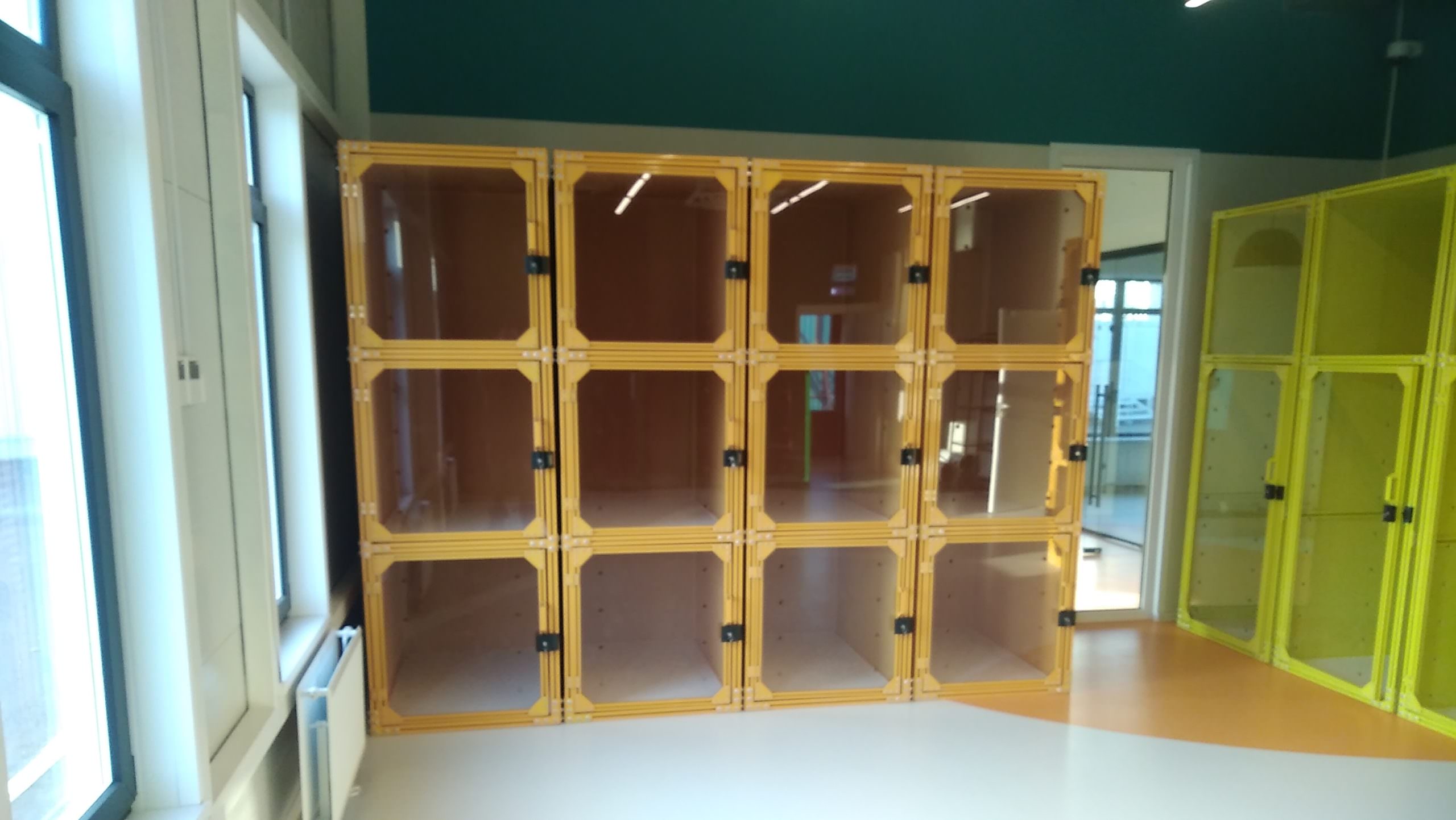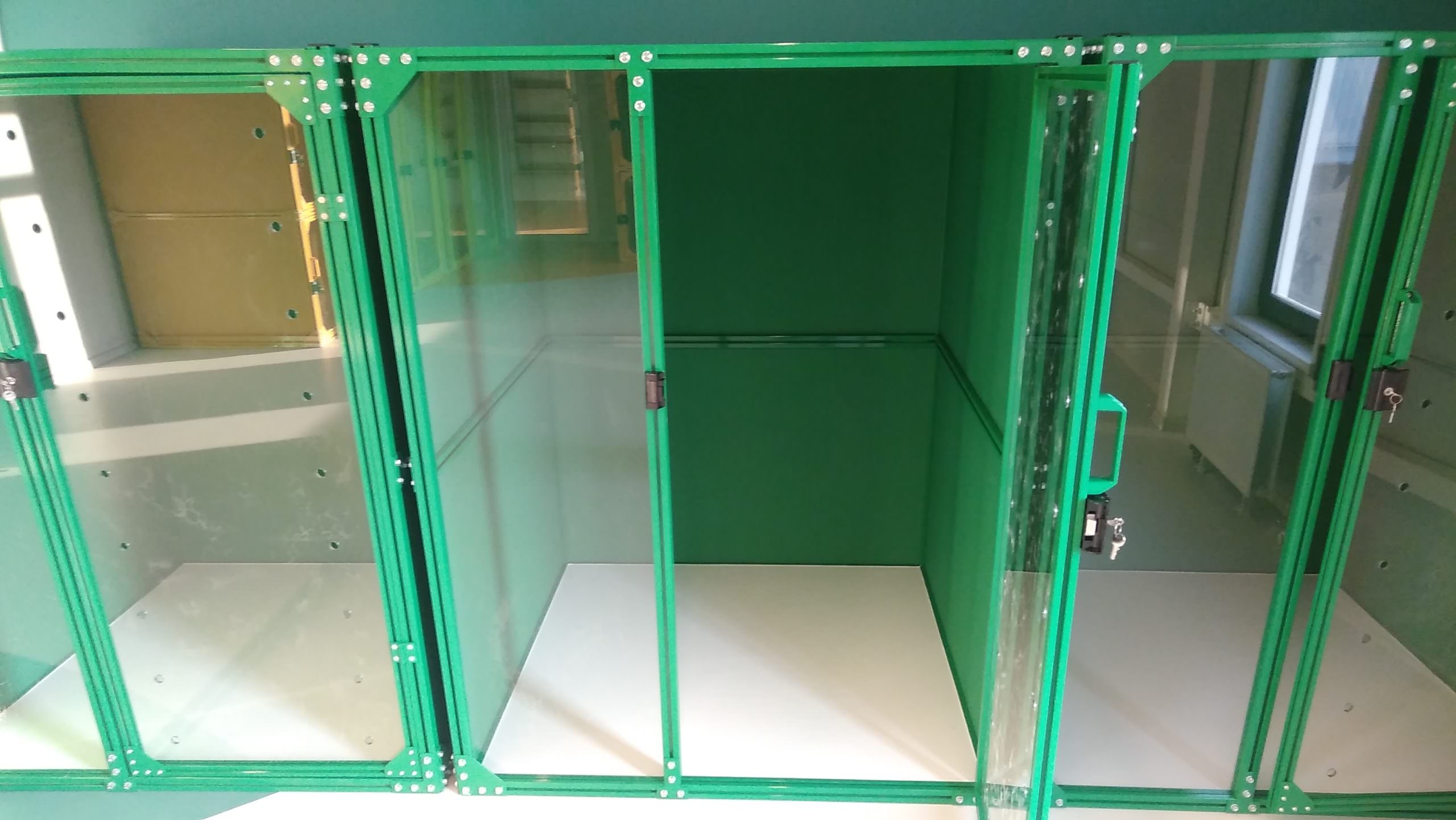 По техническому заданию заказчика требовалось в свежеотремонтированном помещении зоогостиницы возвести вольеры для временного содержания животных. Необходимо было исключить повреждения отделки помещения, производство грязных общестроительных работ и обеспечить хороший визуальный результат. Вольеры не должны были выглядеть как клетки, двери вольеров требовали светопрозрачного заполнения с отверстиями для вентиляции, а сами вольеры необходимо было окрасить в яркие цвета.
